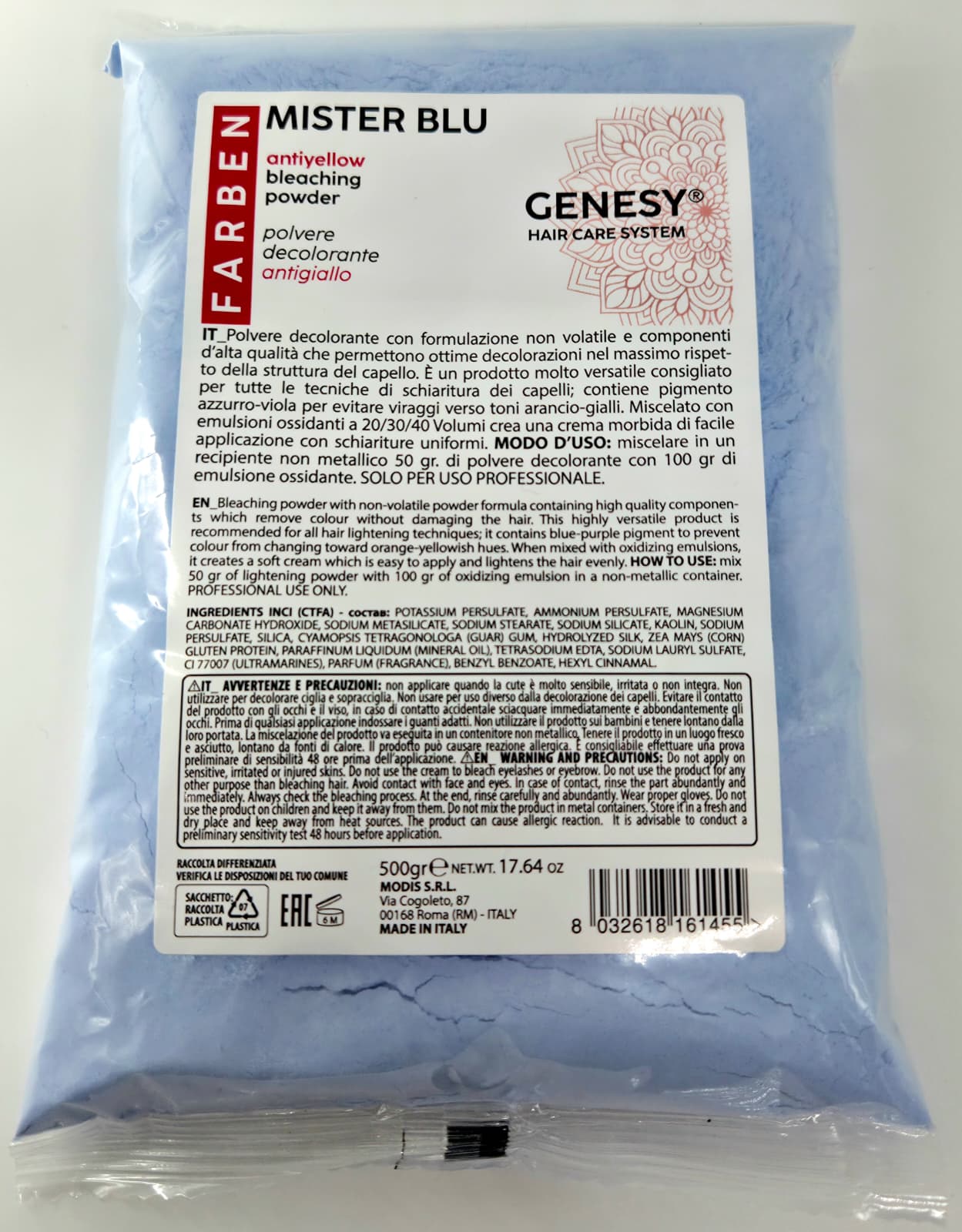 MISTER BLUE- DUST FREE SENZA POLVERE Compact bleanching powder – Polvere decolorante compatta, consente decolorazioni rapide oltre i sette toni. Particolarmente indicata per rapide schiariture per meches e colpi di sole. Conf.da 500 gr.